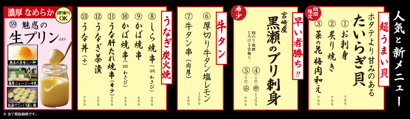 | 営業時間 | 月~金 17:00~24:00 土 15:00~25:00 祝前日 17:00~25:00 日、祝 15:00~24:00 |