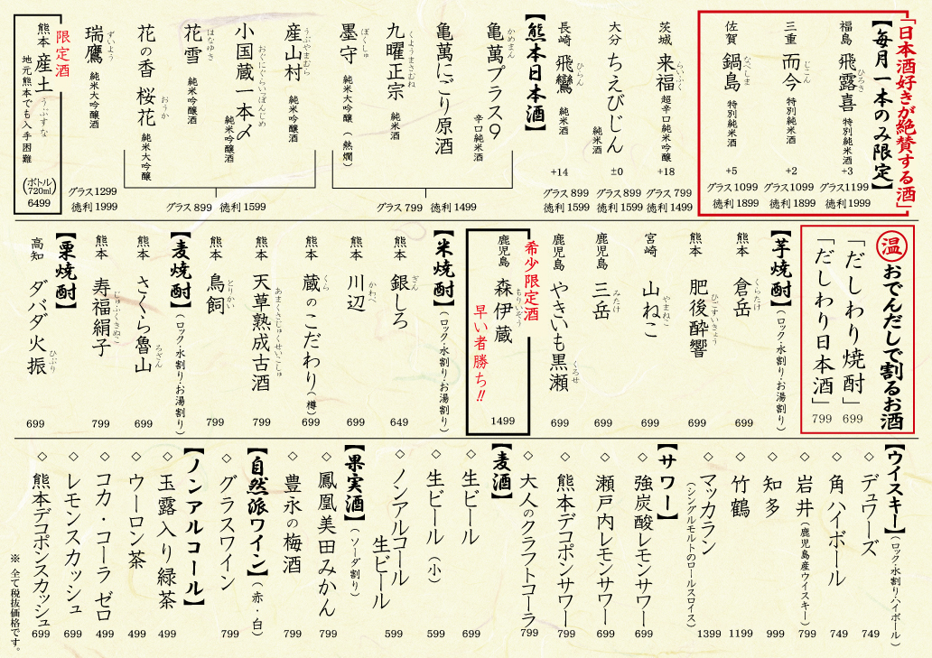| 営業時間 | (平日・日曜)16時〜23時 (祝前日)16時〜24時 (土曜日)15時〜24時 |