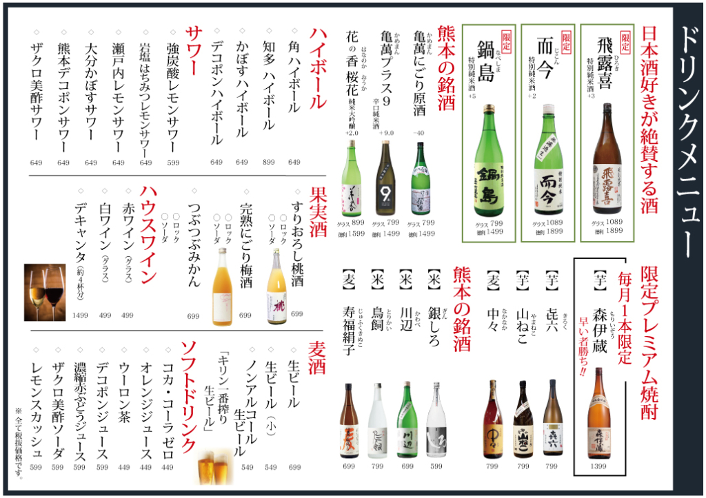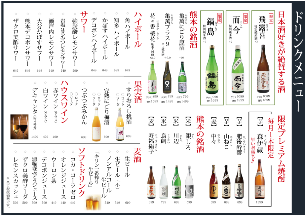 | 営業時間 | 平日 17:00~24:00 土曜 祝前日 11:30~24:00 日曜 祝日 11:30~23:00 |